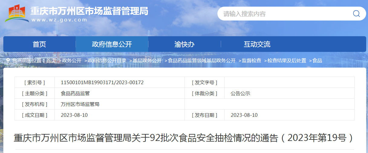 中國質(zhì)量新聞網(wǎng)訊 8月10日,重慶市萬州區(qū)市場監(jiān)督管理局發(fā)布關(guān)于92批次食品安全抽檢情況的通告(2023年第19號(hào))。本次抽檢食用農(nóng)產(chǎn)品、糕點(diǎn)2類食品92批次樣品。抽樣檢驗(yàn)項(xiàng)目全部合格。