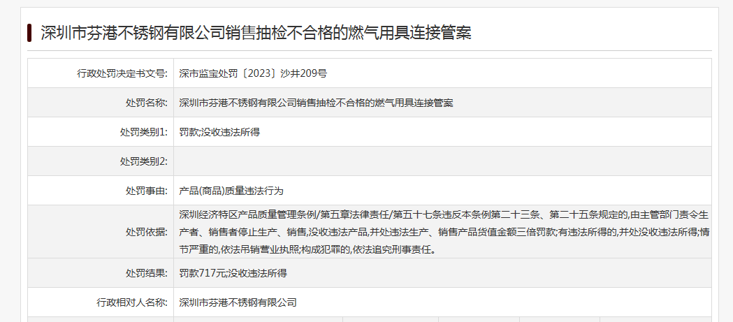 中國質(zhì)量新聞網(wǎng)訊(閆冬)近日,深圳市市場監(jiān)督管理局公布一則行政處罰決定書,案件名稱為“深圳市芬港不銹鋼有限公司銷售抽檢不合格的燃?xì)庥镁哌B接管案”。
