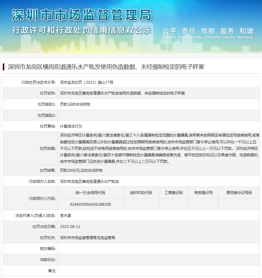 中國質量新聞網(wǎng)訊 近日,深圳市市場監(jiān)督管理局龍崗監(jiān)管局發(fā)布行政處罰信息(深市監(jiān)龍?zhí)幜P〔2023〕園山77號),涉及深圳市龍崗區(qū)橫崗街道通樂水產批發(fā)使用偽造數(shù)據(jù)、未經(jīng)強制檢定的電子秤案。