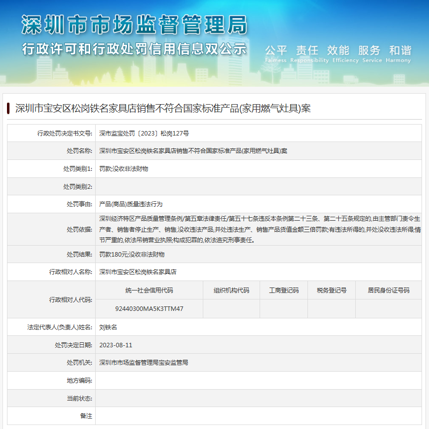 中國質量新聞網(wǎng)訊 近日,深圳市市場監(jiān)督管理局寶安監(jiān)管局發(fā)布行政處罰信息(深市監(jiān)寶處罰〔2023〕松崗127號),涉及深圳市寶安區(qū)松崗鐵名家具店銷售不符合國家標準產(chǎn)品(家用燃氣灶具)案。
