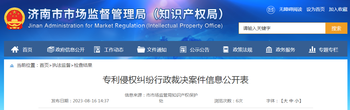 中國(guó)質(zhì)量新聞網(wǎng)訊 8月16日,濟(jì)南市市場(chǎng)監(jiān)督管理局網(wǎng)站公開(kāi)6起專利侵權(quán)糾紛行政裁決案件信息。