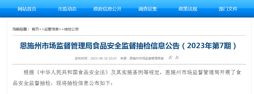 中國質(zhì)量新聞網(wǎng)訊 8月16日,湖北省恩施州市場監(jiān)督管理局網(wǎng)站發(fā)布食品安全監(jiān)督抽檢信息(2023年第7期)。自2023年7月6日至7月31日,恩施州市場監(jiān)管局完成食品安全監(jiān)督抽檢及檢驗數(shù)據(jù)錄入247批次,其中檢驗合格243批次,不合格4批次。