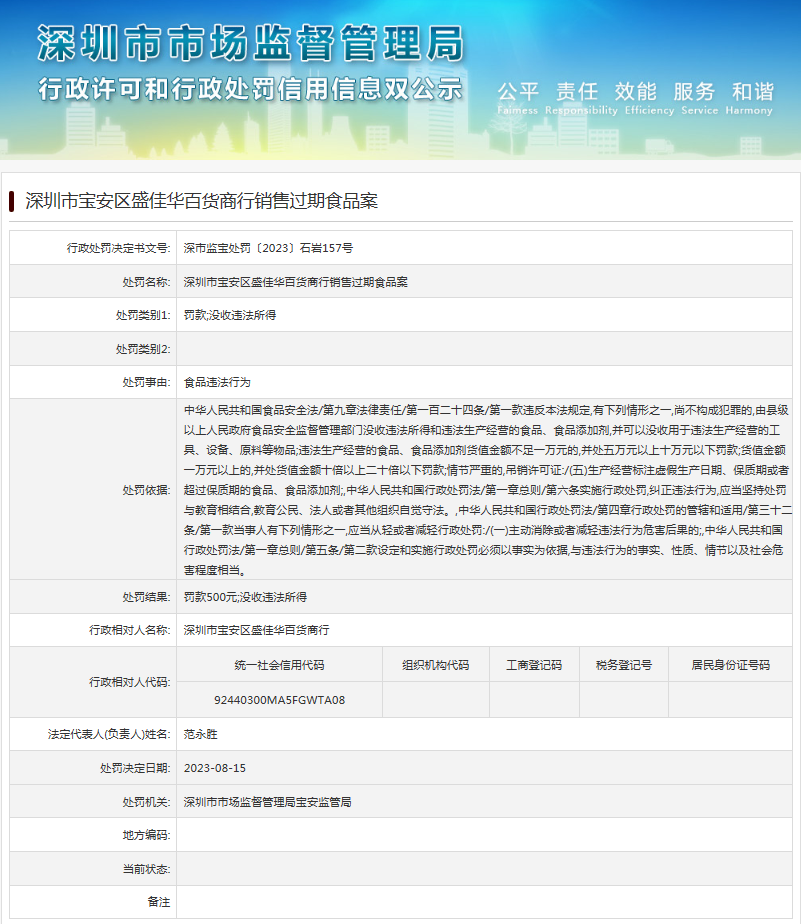 中國質(zhì)量新聞網(wǎng)訊 近日,深圳市市場(chǎng)監(jiān)督管理局寶安監(jiān)管局發(fā)布行政處罰信息(深市監(jiān)寶處罰〔2023〕石巖157號(hào)),涉及深圳市寶安區(qū)盛佳華百貨商行銷售過期食品案。