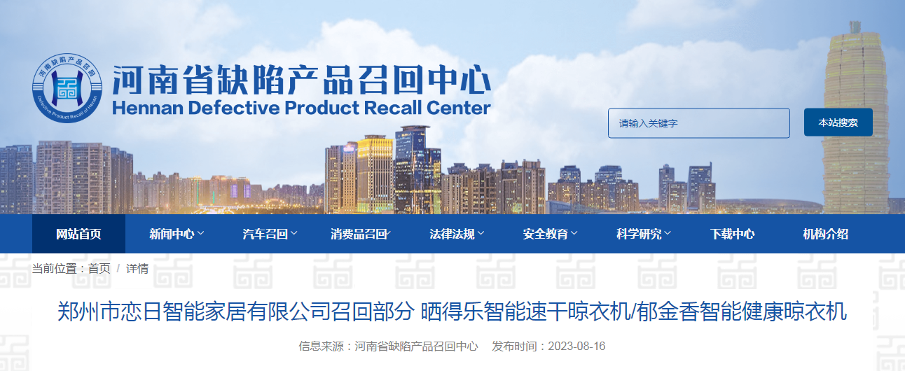 中國質(zhì)量新聞網(wǎng)訊 據(jù)河南省缺陷產(chǎn)品召回中心網(wǎng)站8月16日消息,日前,鄭州市戀日智能家居有限公司按照《消費品召回管理暫行規(guī)定》的要求,主動向河南省市場監(jiān)督管理局、鄭州市市場監(jiān)督管理局報告了召回計劃,將自即日起,召回2022年8月1日至2022年8月10日期間制造的部分曬得樂智能速干晾衣機(型號/規(guī)格SH-D212)/郁金香智能健康晾衣機(型號/規(guī)格T-D312),涉及數(shù)量為46臺。