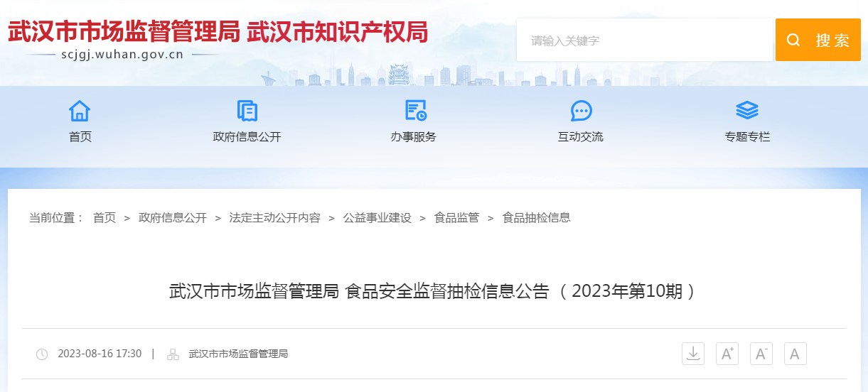 中國質(zhì)量新聞網(wǎng)訊 8月16日,武漢市市場監(jiān)督管理局發(fā)布2023年第10期食品安全監(jiān)督抽檢信息。本期抽檢餅干、茶葉及相關(guān)制品、炒貨食品及堅(jiān)果制品、蛋制品、淀粉及淀粉制品、調(diào)味品、豆制品、方便食品、蜂產(chǎn)品、糕點(diǎn)、罐頭、酒類、可可及焙烤咖啡產(chǎn)品、冷凍飲品、糧食加工品、肉制品、食品添加劑、食糖、食用農(nóng)產(chǎn)品、食用油、油脂及其制品、蔬菜制品、薯類和膨化食品、水產(chǎn)制品、水果制品、速凍食品、糖果制品、特殊膳食食品、飲料共28大類合計1341批次。其中抽樣檢驗(yàn)項(xiàng)目合格樣品1323批次,不合格樣品18批次。