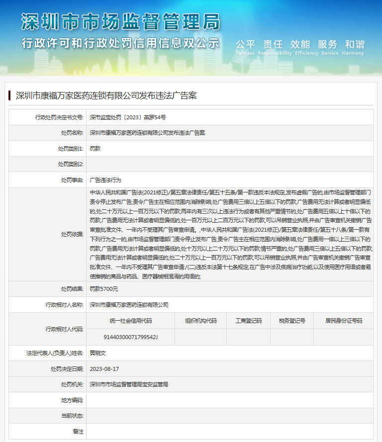 中國質(zhì)量新聞網(wǎng)訊 近日,深圳市市場監(jiān)督管理局寶安監(jiān)管局發(fā)布行政處罰信息(深市監(jiān)寶處罰〔2023〕燕羅54號),涉及深圳市康福萬家醫(yī)藥連鎖有限公司發(fā)布違法廣告案。