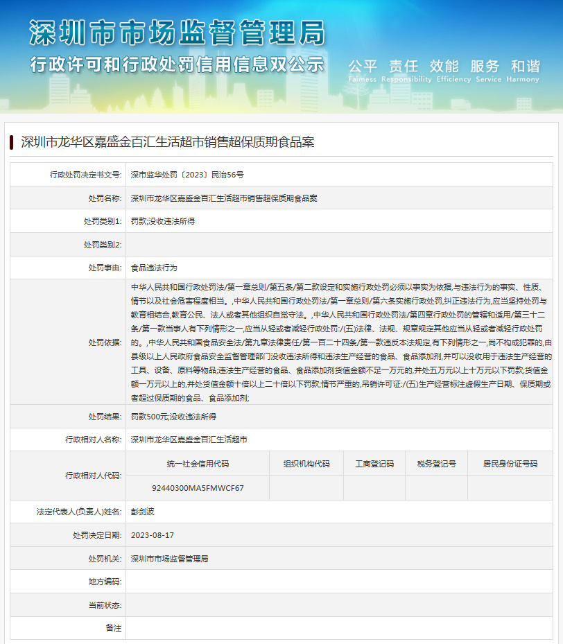 中國質(zhì)量新聞網(wǎng)訊 近日,深圳市市場(chǎng)監(jiān)督管理局發(fā)布行政處罰信息(深市監(jiān)華處罰〔2023〕民治56號(hào)),涉及深圳市龍華區(qū)嘉盛金百匯生活超市銷售超保質(zhì)期食品案。