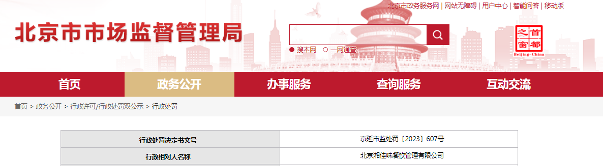 中國質(zhì)量新聞網(wǎng)訊 8月22日,北京市延慶區(qū)市場監(jiān)督管理局對北京湘佳味餐飲管理有限公司作出行政處罰。行政處罰決定書文號:京延市監(jiān)處罰〔2023〕607號。