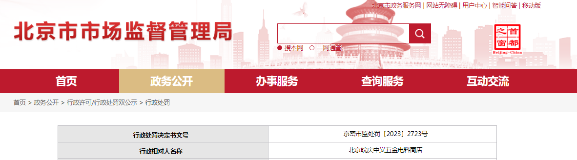 中國質量新聞網訊 8月21日,北京市密云區(qū)市場監(jiān)督管理局對北京皖慶中義五金電料商店作出行政處罰。行政處罰決定書文號:京密市監(jiān)處罰〔2023〕2723號。