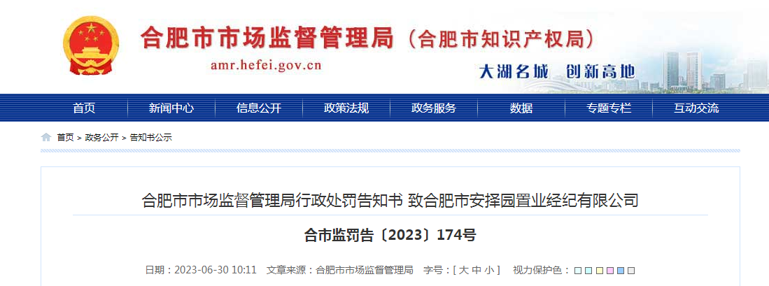 合肥市市場(chǎng)監(jiān)督管理局行政處罰告知書 致合肥市安擇園置業(yè)經(jīng)紀(jì)有限公司