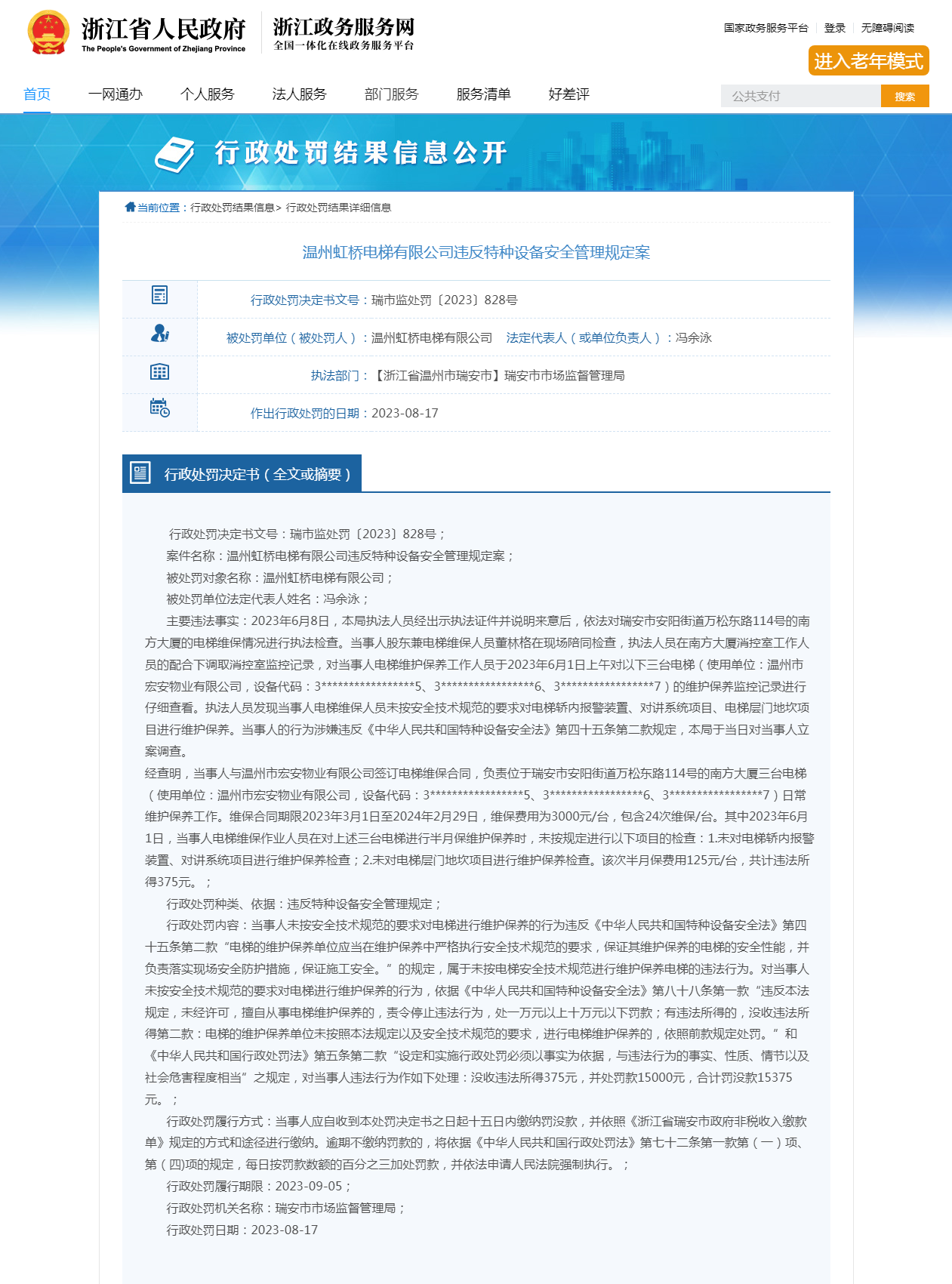 中國(guó)質(zhì)量新聞網(wǎng)訊 近日,浙江省瑞安市市場(chǎng)監(jiān)督管理局發(fā)布行政處罰決定書(瑞市監(jiān)處罰〔2023〕828號(hào)),涉及溫州虹橋電梯有限公司違反特種設(shè)備安全管理規(guī)定案。