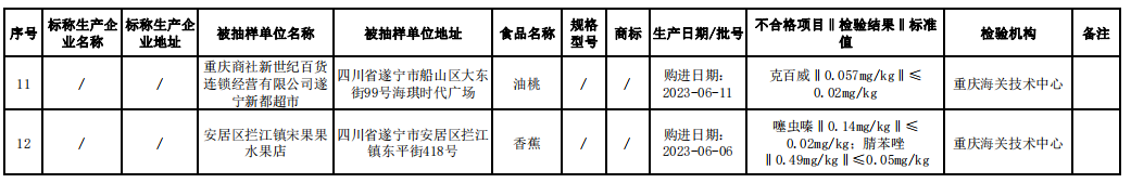不合格食品涉及香蕉、豇豆、韭菜、油麥菜、油桃等。