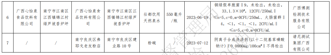 所有抽檢樣品遵循隨機抽樣原則。本次共抽檢食品和食用農產品共244批次,合格237批次,不合格7批次。不合格產品涉及廣西旱田嶺農業(yè)發(fā)展有限公司、馬山縣山山農業(yè)科技有限公司、廣西南寧市桂爽食品有限公司、廣西心怡泉食品飲料有限公司等標識生產企業(yè)。