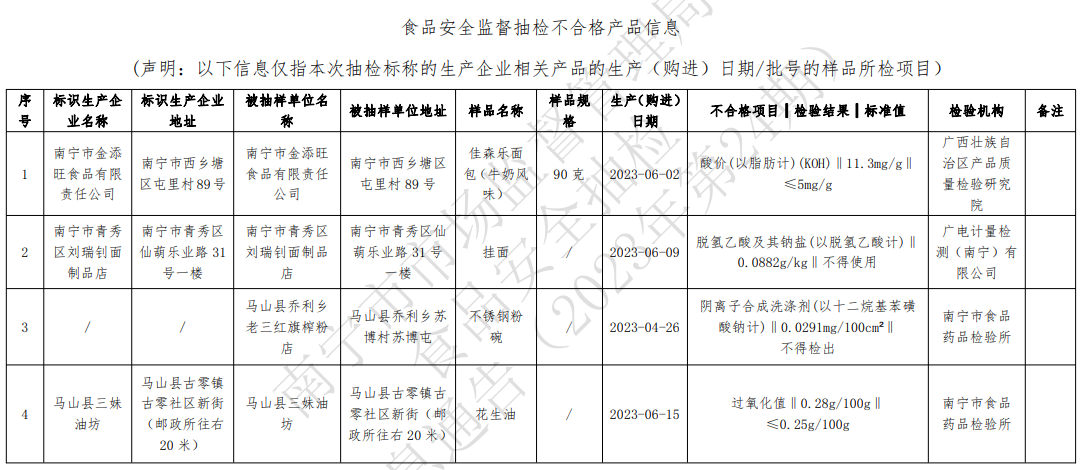 所有抽檢樣品遵循隨機抽樣原則。本次共抽檢食品和食用農(nóng)產(chǎn)品共242批次,合格235批次,不合格7批次。不合格產(chǎn)品涉及南寧市金添旺食品有限責(zé)任公司、南寧市青秀區(qū)劉瑞釗面制品店、馬山縣三妹油坊、馬山縣天海食品廠、南寧市眾鼎食品有限公司等標(biāo)識生產(chǎn)企業(yè)。