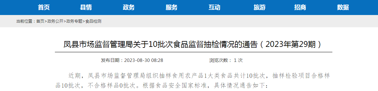 中國質(zhì)量新聞網(wǎng)訊 8月30日,陜西省鳳縣市場監(jiān)督管理局發(fā)布關(guān)于10批次食品監(jiān)督抽檢情況的通告(2023年第29期)。本期抽檢食用農(nóng)產(chǎn)品1大類食品共計(jì)10批次,抽樣檢驗(yàn)項(xiàng)目合格樣品10批次,不合格樣品0批次。