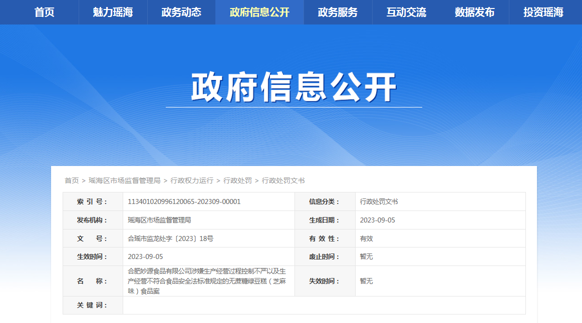 合肥妙源食品有限公司涉嫌生產(chǎn)經(jīng)營過程控制不嚴(yán)以及生產(chǎn)經(jīng)營不符合食品安全法標(biāo)準(zhǔn)規(guī)定的無蔗糖綠豆糕(芝麻味)食品案