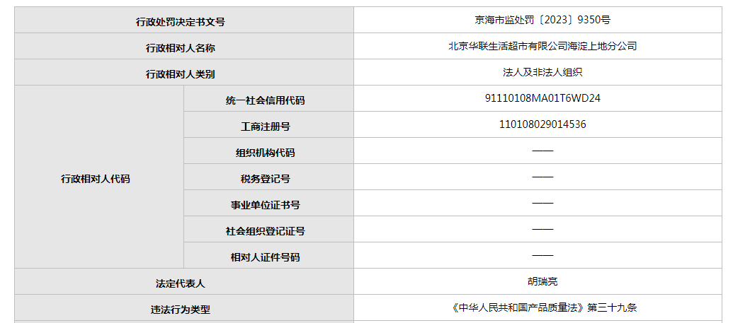 本網(wǎng)注意到,北京華聯(lián)生活超市有限公司海淀上地分公司成立于2020年6月,負(fù)責(zé)人為胡瑞亮。成立以來,從2021年到今年,包括上述處罰已經(jīng)五次被市場(chǎng)監(jiān)管部門行政處罰。