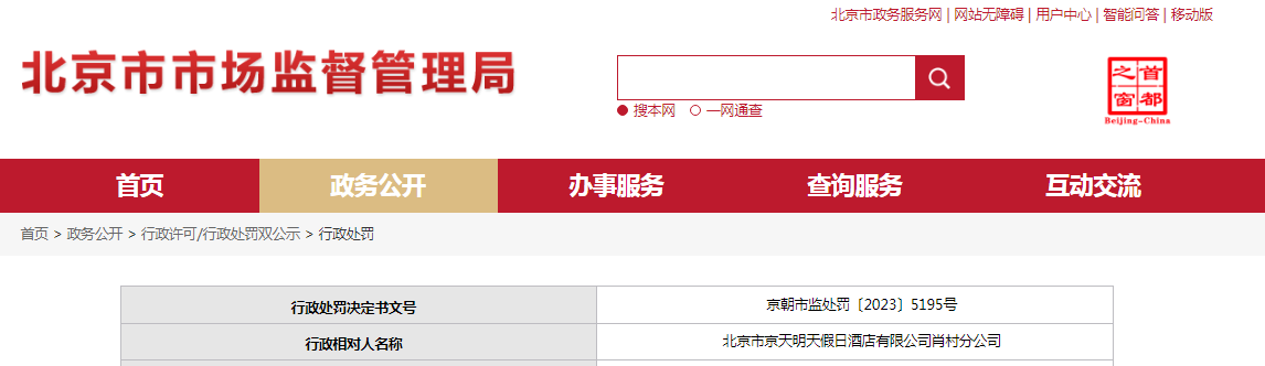 中國(guó)質(zhì)量新聞網(wǎng)訊 近日,北京市朝陽(yáng)區(qū)市場(chǎng)監(jiān)督管理局對(duì)北京市京天明天假日酒店有限公司肖村分公司作出行政處罰。行政處罰決定書(shū)文號(hào):京朝市監(jiān)處罰〔2023〕5195號(hào)。