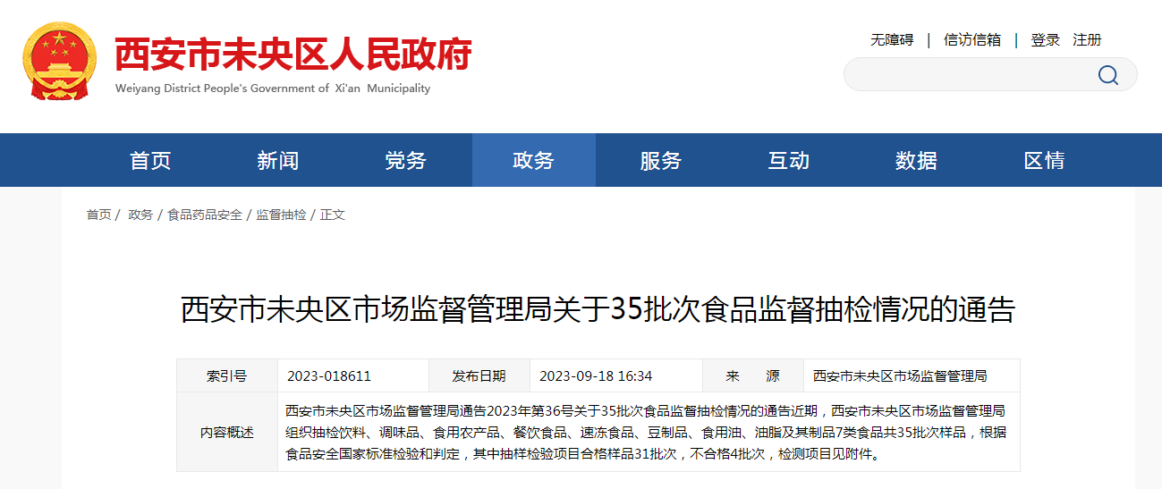 中國(guó)質(zhì)量新聞網(wǎng)訊 近日,西安市未央?yún)^(qū)市場(chǎng)監(jiān)督管理局發(fā)布關(guān)于35批次食品監(jiān)督抽檢情況的通告(2023年第36號(hào))。
