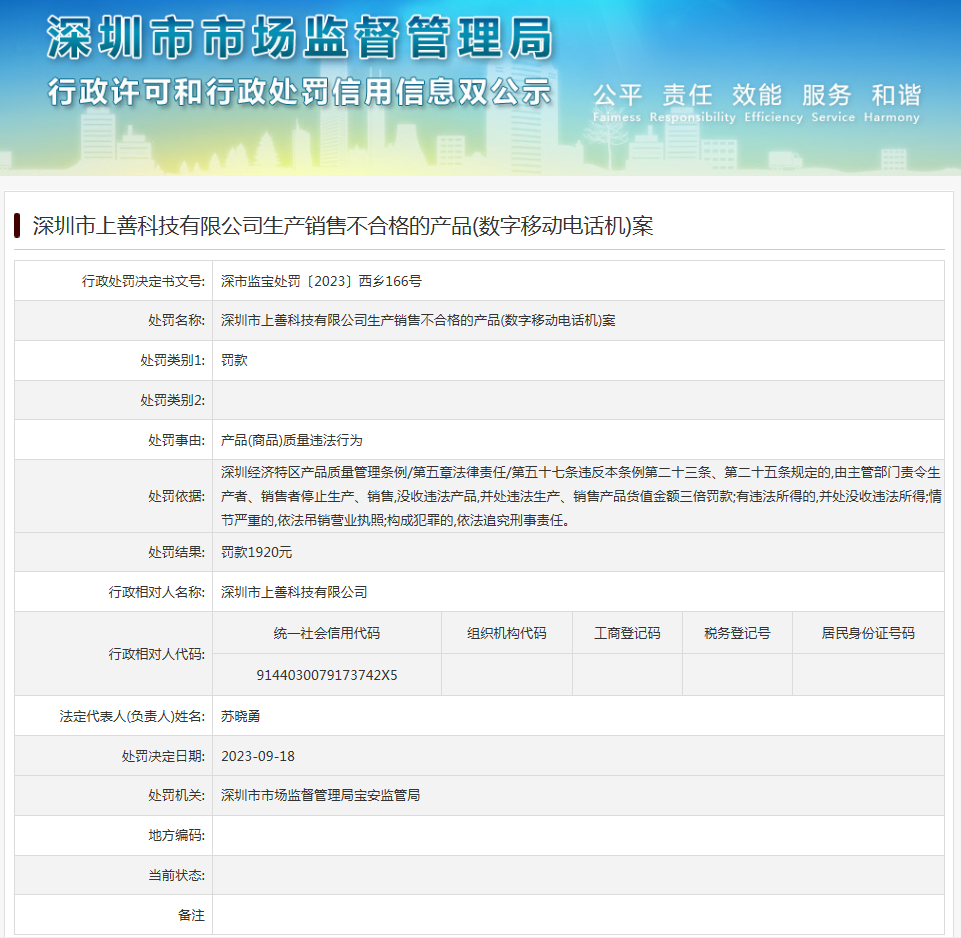 中國質(zhì)量新聞網(wǎng)訊 近日,深圳市市場監(jiān)督管理局寶安監(jiān)管局發(fā)布行政處罰信息(深市監(jiān)寶處罰〔2023〕西鄉(xiāng)166號),涉及深圳市上善科技有限公司生產(chǎn)銷售不合格的產(chǎn)品(數(shù)字移動電話機(jī))案。