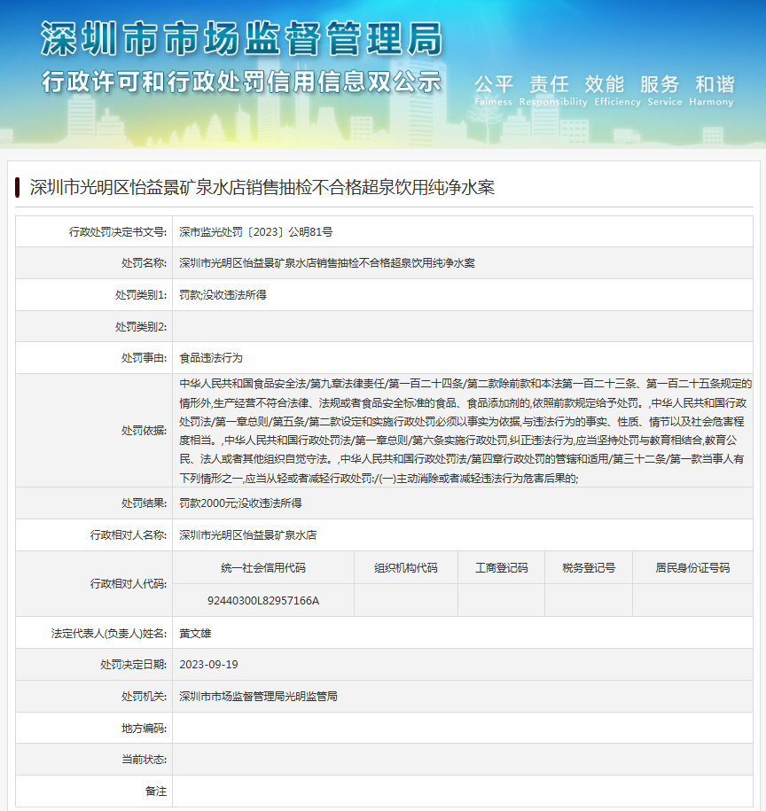 中國(guó)質(zhì)量新聞網(wǎng)訊 近日,深圳市市場(chǎng)監(jiān)督管理局光明監(jiān)管局發(fā)布行政處罰信息(深市監(jiān)光處罰〔2023〕公明81號(hào)),涉及深圳市光明區(qū)怡益景礦泉水店銷售抽檢不合格超泉飲用純凈水案。