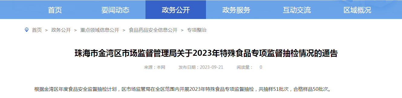中國質(zhì)量新聞網(wǎng)訊 9月21日,廣東省珠海市金灣區(qū)市場監(jiān)督管理局發(fā)布關(guān)于2023年特殊食品專項監(jiān)督抽檢情況的通告。根據(jù)金灣區(qū)年度食品安全監(jiān)督抽檢計劃,區(qū)市場監(jiān)管局在全區(qū)范圍內(nèi)開展2023年特殊食品專項監(jiān)督抽檢,共抽樣51批次,合格樣品50批次、不合格樣品1批次。