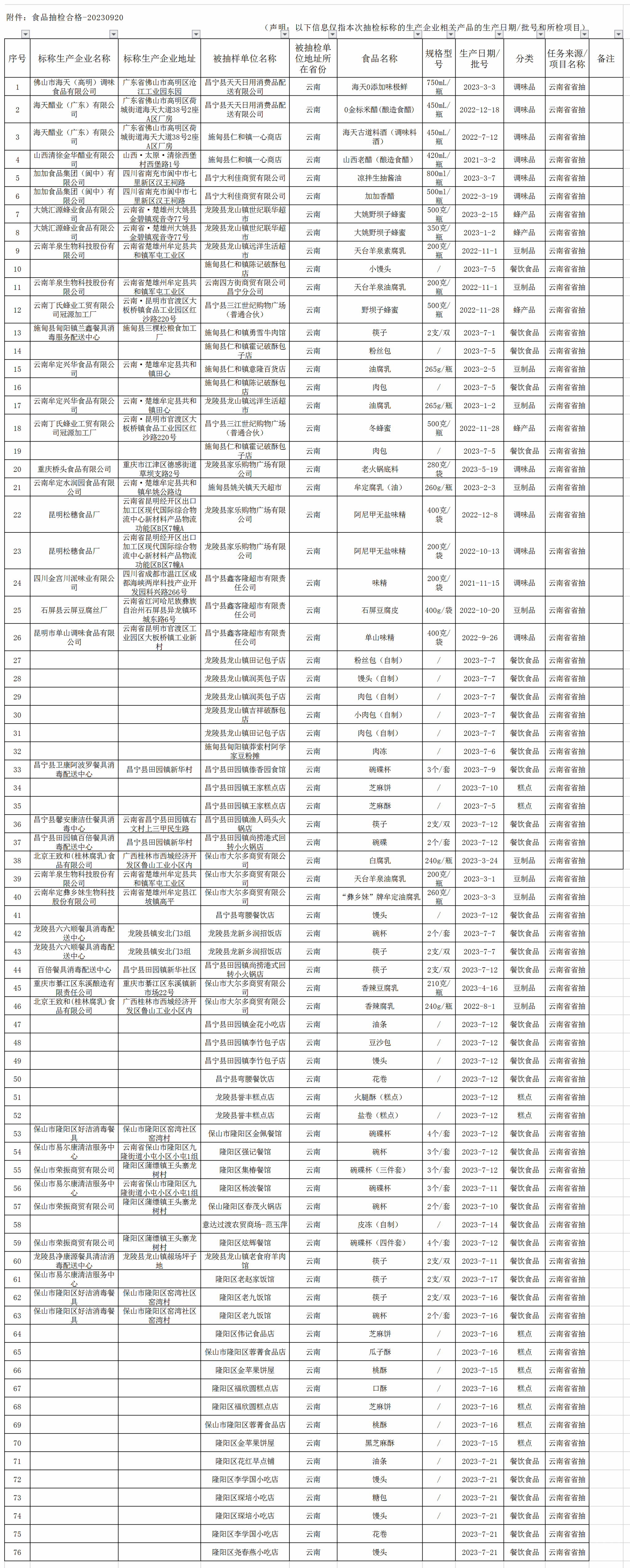 中國質(zhì)量新聞網(wǎng)訊 近日,云南省保山市市場監(jiān)督管理局發(fā)布2023年第5期食品安全抽檢信息。本期抽檢餐飲食品、糕點(diǎn)、調(diào)味品、豆制品、蜂產(chǎn)品等5大類食品81批次,產(chǎn)品合格率93.83%?,F(xiàn)將76批次抽檢合格產(chǎn)品信息公告如下: