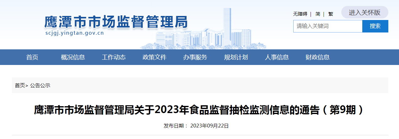 中國質(zhì)量新聞網(wǎng)訊 近日,江西省鷹潭市市場監(jiān)督管理局發(fā)布關(guān)于2023年食品監(jiān)督抽檢監(jiān)測信息的通告(第9期)。