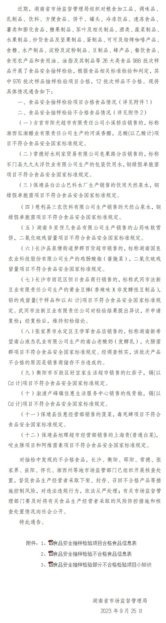 中國質(zhì)量新聞網(wǎng)訊 2023年9月26日,湖南省市場監(jiān)督管理局網(wǎng)站發(fā)布關(guān)于988批次食品安全抽樣檢驗情況的通告(2023年第22期)。