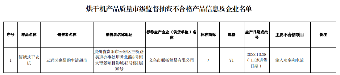 不合格產(chǎn)品涉及標(biāo)稱生產(chǎn)企業(yè)(供貨單位)名稱為義烏市聯(lián)楊貿(mào)易有限公司、樣品名稱為便攜式干衣機(jī)。不合格項(xiàng)涉及輸入功率和電流。