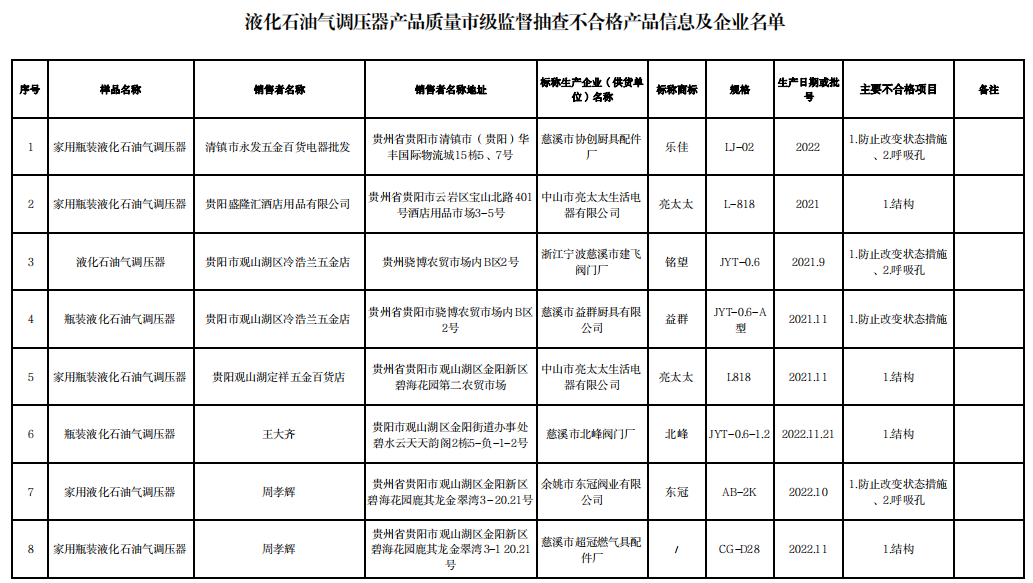 中國質(zhì)量新聞網(wǎng)訊 據(jù)貴陽市市場監(jiān)管局網(wǎng)站消息,根據(jù)《中華人民共和國產(chǎn)品質(zhì)量法》規(guī)定和有關工作部署,該局組織開展了燃氣灶具、可燃氣體探測器、燃氣用不銹鋼波紋軟管、液化石油氣調(diào)壓器、燃氣熱水器、安全帶、安全帽等12種產(chǎn)品質(zhì)量監(jiān)督抽查。其中,抽查了3個區(qū)縣8家銷售商銷售的10批次液化石油氣調(diào)壓器產(chǎn)品,發(fā)現(xiàn)不合格產(chǎn)品8批次。