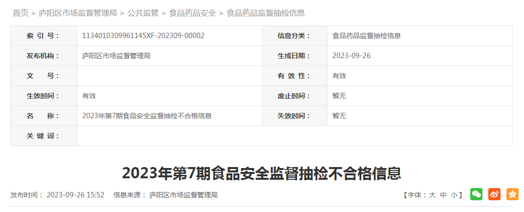 中國質(zhì)量新聞網(wǎng)訊 9月26日,合肥市廬陽區(qū)人民政府網(wǎng)站發(fā)布2023年第7期食品安全監(jiān)督抽檢不合格信息。