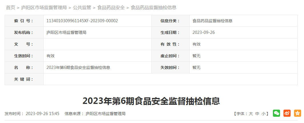 中國質(zhì)量新聞網(wǎng)訊 9月26日,合肥市廬陽區(qū)人民政府網(wǎng)站發(fā)布2023年第6期食品安全監(jiān)督抽檢信息。