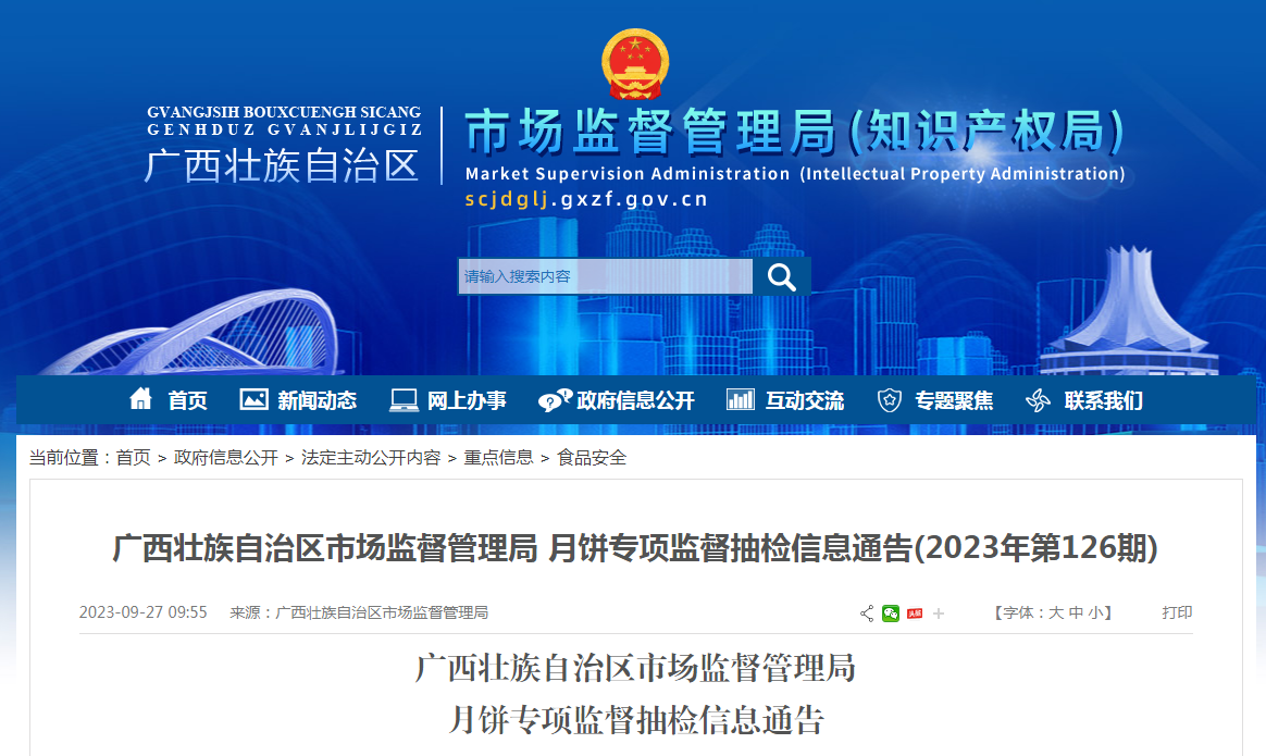 中國(guó)質(zhì)量新聞網(wǎng)訊 9月27日,廣西壯族自治區(qū)市場(chǎng)監(jiān)督管理局網(wǎng)站發(fā)布月餅專項(xiàng)監(jiān)督抽檢信息(2023年第126期)。本期抽檢月餅樣品156批次。根據(jù)食品安全國(guó)家標(biāo)準(zhǔn)、相關(guān)產(chǎn)品明示標(biāo)準(zhǔn)進(jìn)行檢驗(yàn)和判定,初檢檢出1批次樣品不合格,發(fā)現(xiàn)的問(wèn)題為微生物污染。具體情況如下: