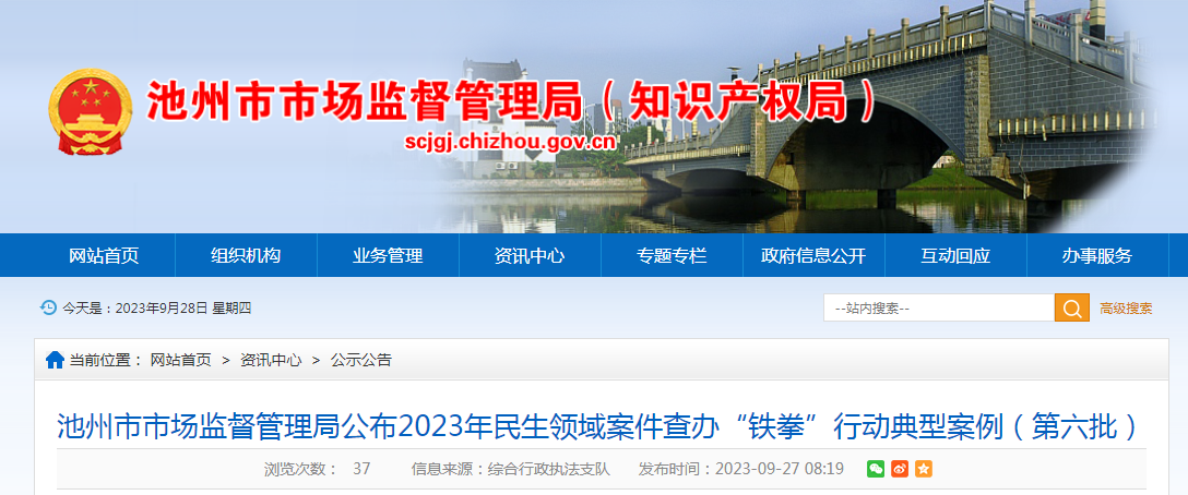 2023年,安徽省池州市市場(chǎng)監(jiān)管局開展2023民生領(lǐng)域案件查辦“鐵拳”行動(dòng),持續(xù)加大重點(diǎn)領(lǐng)域執(zhí)法力度,依法嚴(yán)厲打擊民生領(lǐng)域侵害人民群眾利益和社會(huì)公共利益的違法行為,打造執(zhí)法為民“鐵拳”品牌。現(xiàn)公布“鐵拳”行動(dòng)第六批典型案例。