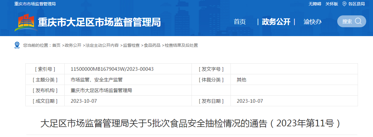 中國(guó)質(zhì)量新聞網(wǎng)訊 10月7日,重慶市大足區(qū)市場(chǎng)監(jiān)督管理局發(fā)布關(guān)于5批次食品安全抽檢情況的通告(2023年第11號(hào))。本次食品安全監(jiān)督抽檢,檢出5批次樣品不合格。根據(jù)食品安全國(guó)家標(biāo)準(zhǔn),個(gè)別項(xiàng)目不合格,其產(chǎn)品即判定為不合格產(chǎn)品。