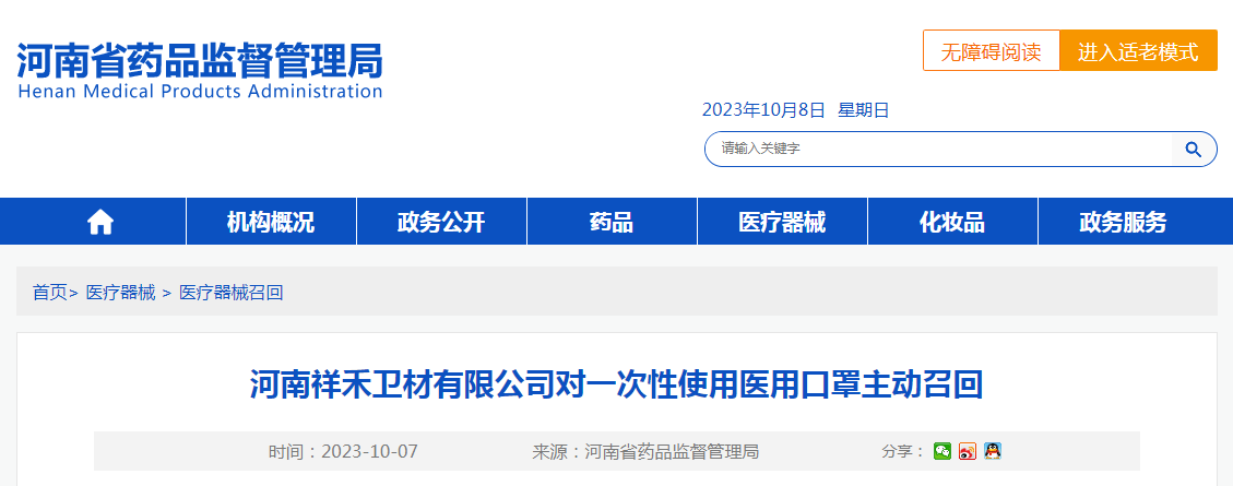 河南祥禾衛(wèi)材有限公司報告,由于其生產(chǎn)的一批次一次性使用醫(yī)用口罩不符合規(guī)定,企業(yè)對其主動召回,召回級別為三級。召回產(chǎn)品的型號、規(guī)格及批次等詳細信息見《醫(yī)療器械召回事件報告表》。