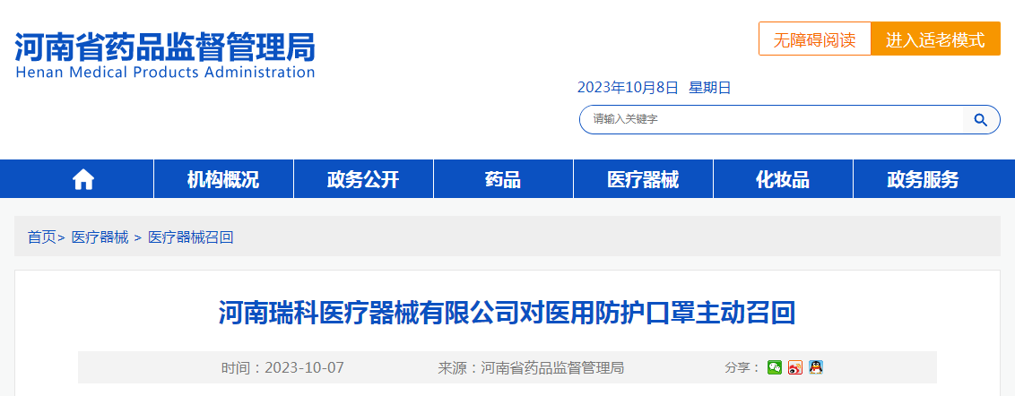 河南瑞科醫(yī)療器械有限公司報(bào)告,由于其生產(chǎn)的一批次醫(yī)用防護(hù)口罩不符合規(guī)定,企業(yè)對(duì)其主動(dòng)召回,召回級(jí)別為三級(jí)。召回產(chǎn)品的型號(hào)、規(guī)格及批次等詳細(xì)信息見《醫(yī)療器械召回事件報(bào)告表》。
