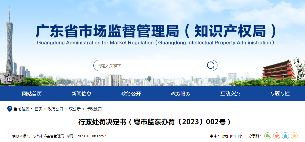 中國質(zhì)量新聞網(wǎng)訊 10月8日,廣東省市場監(jiān)督管理局網(wǎng)站發(fā)布行政處罰決定書(粵市監(jiān)東辦罰〔2023〕002號)。