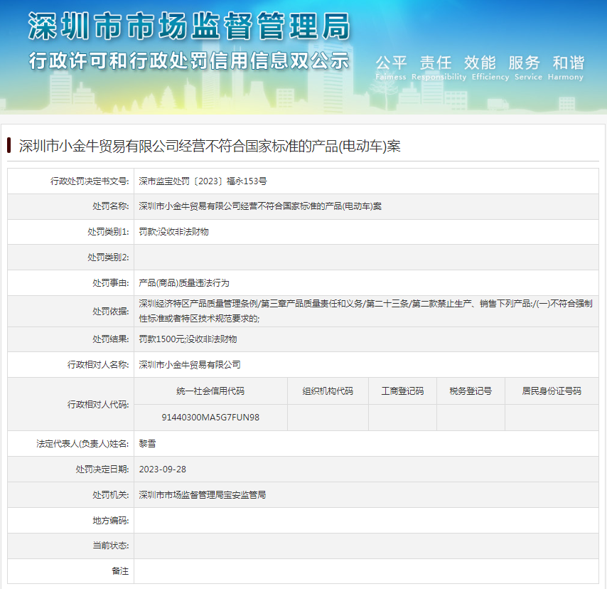 中國質(zhì)量新聞網(wǎng)訊 近日,深圳市市場監(jiān)督管理局寶安監(jiān)管局發(fā)布行政處罰信息(深市監(jiān)寶處罰〔2023〕福永153號),涉及深圳市小金牛貿(mào)易有限公司經(jīng)營不符合國家標(biāo)準(zhǔn)的產(chǎn)品(電動車)案。