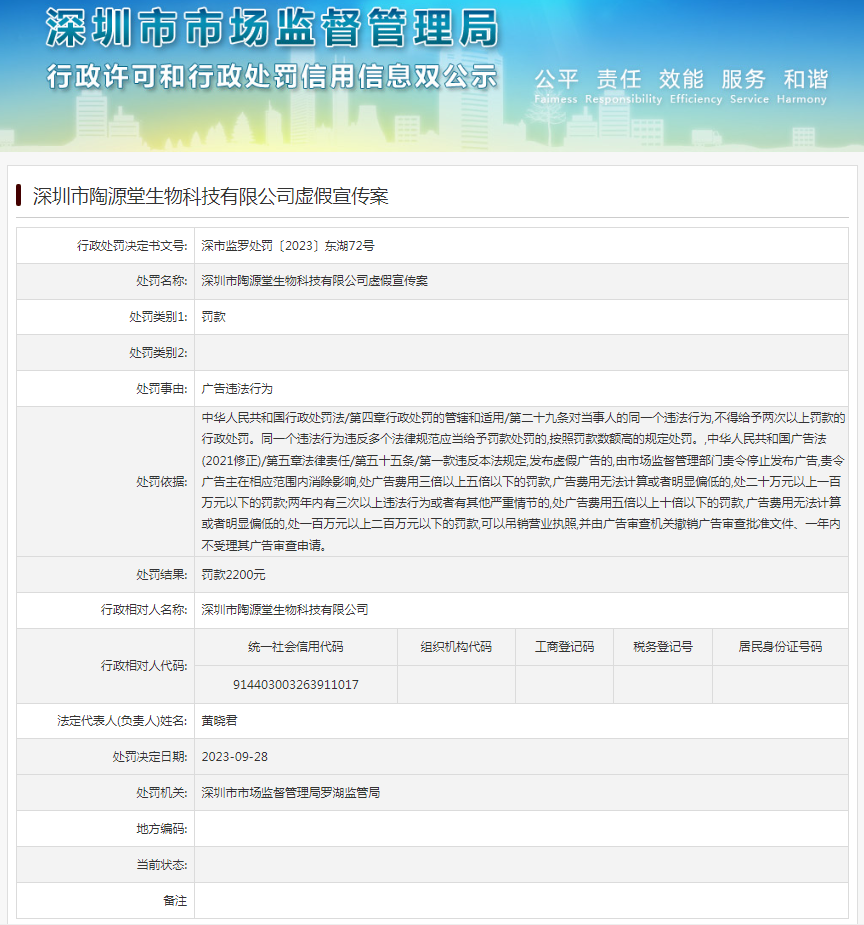 中國質(zhì)量新聞網(wǎng)訊 近日,深圳市市場監(jiān)督管理局羅湖監(jiān)管局發(fā)布行政處罰信息(深市監(jiān)羅處罰〔2023〕東湖72號),涉及深圳市陶源堂生物科技有限公司虛假宣傳案。