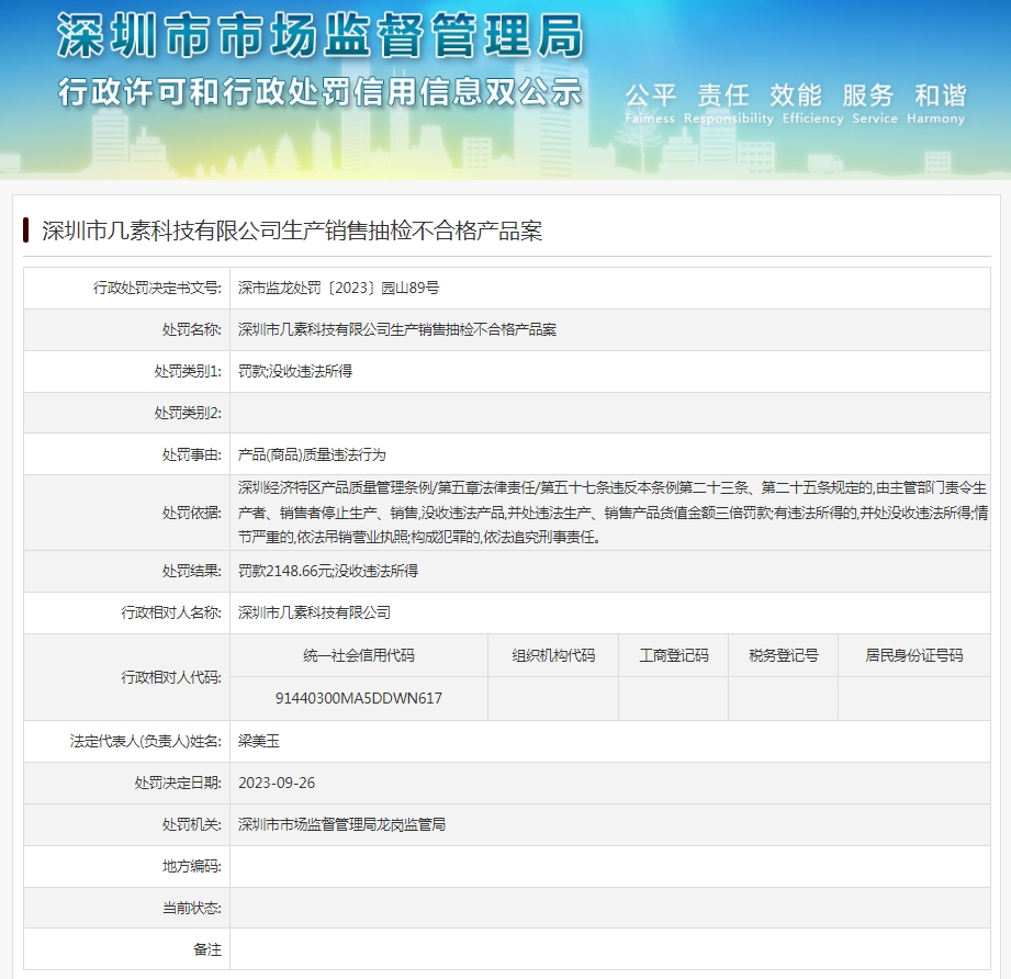 中國質(zhì)量新聞網(wǎng)訊 日前,深圳市市場監(jiān)督管理局龍崗監(jiān)管局發(fā)布行政處罰信息(深市監(jiān)龍?zhí)幜P〔2023〕園山89號),涉及深圳市幾素科技有限公司生產(chǎn)銷售抽檢不合格產(chǎn)品案。