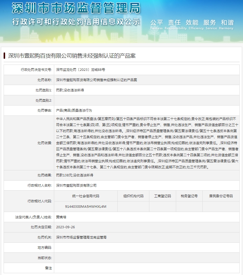 中國質量新聞網訊 日前,深圳市市場監(jiān)督管理局龍崗監(jiān)管局發(fā)布行政處罰信息(深市監(jiān)龍?zhí)幜P〔2023〕龍城88號),涉及深圳市壹起購百貨有限公司銷售未經強制認證的產品案。