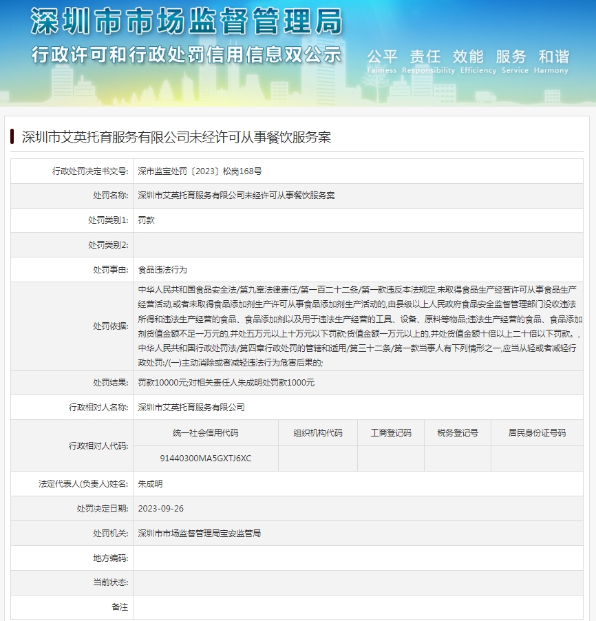 中國質(zhì)量新聞網(wǎng)訊 日前,深圳市市場監(jiān)督管理局寶安監(jiān)管局發(fā)布行政處罰信息(深市監(jiān)寶處罰〔2023〕松崗168號),涉及深圳市艾英托育服務有限公司未經(jīng)許可從事餐飲服務案。