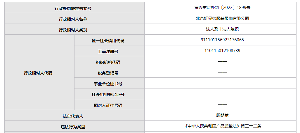 公開資料顯示,北京好兄弟服裝服飾有限公司成立于2009年7月,注冊資本50萬人民幣,法定代表人為顧朝獻(xiàn)。經(jīng)營范圍包括銷售服裝、服飾、鞋、帽、玩具、箱包、皮革制品、紡織品、醫(yī)療器械Ⅰ類、醫(yī)療器械Ⅱ類、五金產(chǎn)品、日用品;技術(shù)開發(fā);技術(shù)進(jìn)出口;貨物進(jìn)出口;加工服裝(限在外埠從事生產(chǎn)活動(dòng));銷售食品。