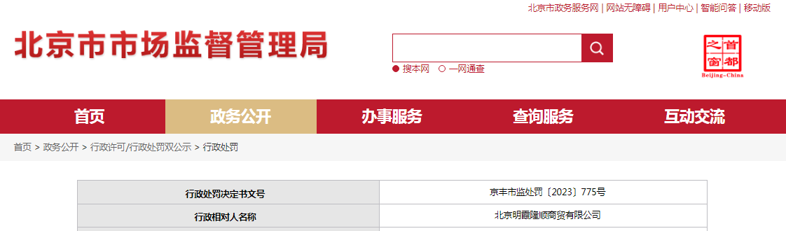中國質(zhì)量新聞網(wǎng)訊 近日,北京市豐臺區(qū)市場監(jiān)督管理局對北京明霞隆順商貿(mào)有限公司作出行政處罰。行政處罰決定書文號:京豐市監(jiān)處罰〔2023〕775號。