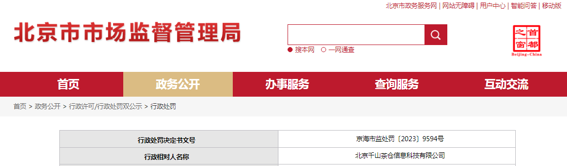 中國質量新聞網訊 近日,北京市海淀區(qū)市場監(jiān)督管理局對北京千山茶倉信息科技有限公司作出行政處罰。行政處罰決定書文號:京海市監(jiān)處罰〔2023〕9594號。