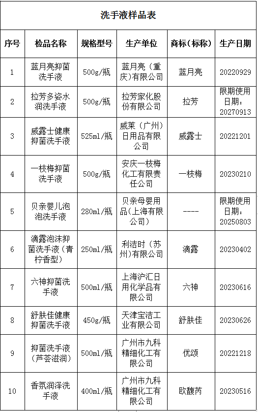 本次比較試驗主要針對消費者關(guān)注度高、銷量好的抑菌洗手液及普通洗手液產(chǎn)品,由工作人員模擬普通消費者的身份在本市各線下實體店匿名購買。共采購到不同品牌的洗手液樣品10款,其中抑菌洗手液7款,涉及品牌有藍月亮、威露士、一枝梅、滴露、六神、舒膚佳、優(yōu)頌;普通洗手液3款,涉及品牌有拉芳、貝親(貝親母嬰用品)及歐馥芮(具體見上表)。