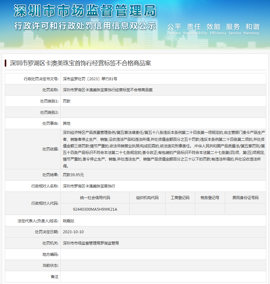 中國質(zhì)量新聞網(wǎng)訊 近日,深圳市市場監(jiān)督管理局羅湖監(jiān)管局發(fā)布行政處罰信息(深市監(jiān)羅處罰〔2023〕翠竹81號),涉及深圳市羅湖區(qū)卡澳美珠寶首飾行經(jīng)營標(biāo)簽不合格商品案。