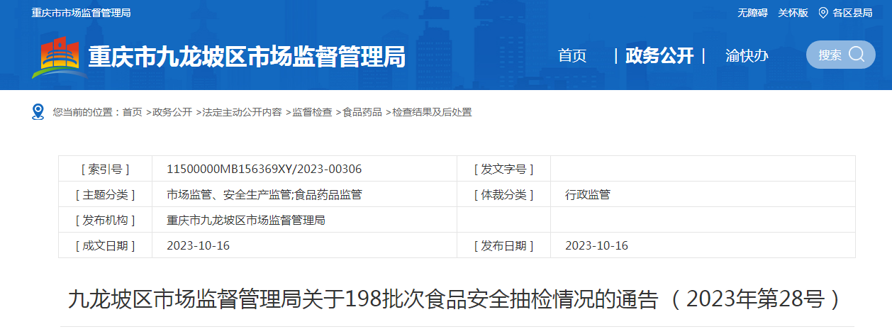中國質(zhì)量新聞網(wǎng)訊 10月16日,重慶市九龍坡區(qū)市場監(jiān)督管理局發(fā)布關(guān)于198批次食品安全抽檢情況的通告 (2023年第28號)。本次抽檢餐飲食品、茶葉及相關(guān)制品、炒貨食品及堅果制品、蛋制品、淀粉及淀粉制品、調(diào)味品、豆制品、方便食品、糕點、罐頭、酒類、糧食加工品、肉制品、乳制品、食用農(nóng)產(chǎn)品、蔬菜制品、速凍食品、飲料、薯類和膨化食品等19類食品198批次樣品。抽樣檢驗項目合格樣品195批次,不合格樣品3批次。